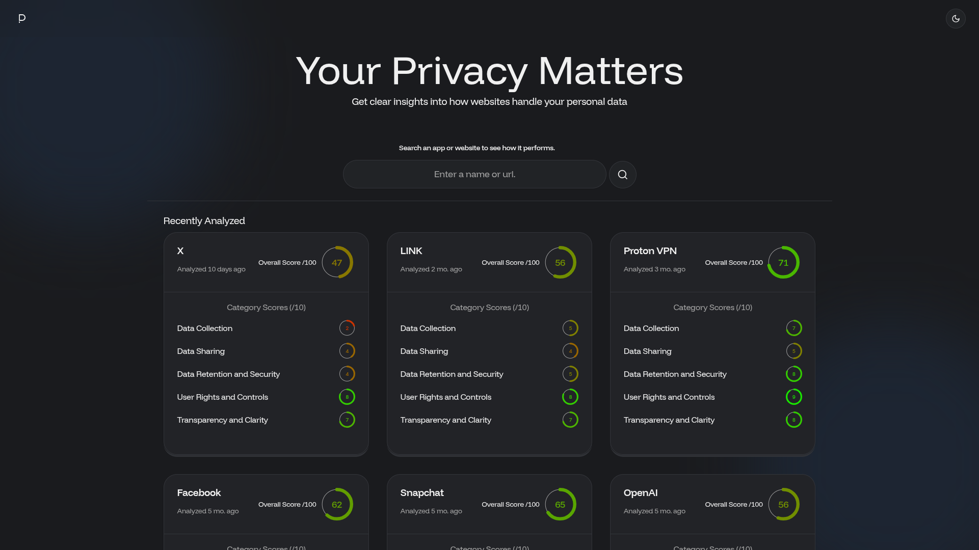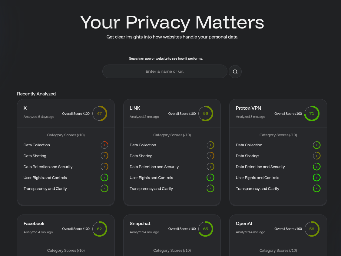 A tool that reads the fine print so you don't have to. Paste in any website, get back a clear privacy score with the actual important stuff highlighted.